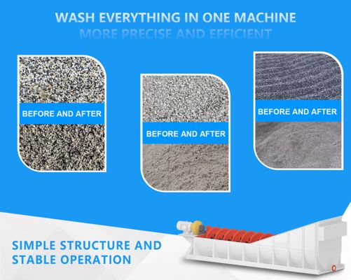 Professional design guide plates and adjustable long overflow weir boards, with optimized spiral speed to ensure the accuracy of material washing and grading; optimize the design drainage groove, effectively ensure that the washed materials are lost less, and the moisture in the material is removed to the maximum extent, and the sewage can be used in circulation.