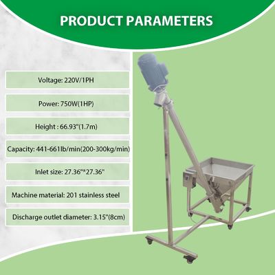 OEM Incline Auger Screw Conveyor Industrial Helical Hopper Spiral Powder Feeder 750W Stainless Steel 441-661 lb/min Spring Loader 220V 1PH