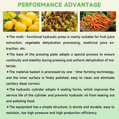 อุปกรณ์กดอุตสาหกรรมนี้เชี่ยวชาญด้านกระบวนการคายน้ำ สกัดน้ำผลไม้ และขจัดเกลือสำหรับงานแปรรูปอาหารต่างๆ รวมถึงผลิตภัณฑ์จากถั่ว ผักดอง วัสดุยา และผัก ระบบยังทำการแยกของแข็งและของเหลวสำหรับวัสดุอื่นๆ ที่ทนต่อการอัดขึ้นรูป โดยประสิทธิภาพจะแตกต่างกันไปตามลักษณะของวัสดุ